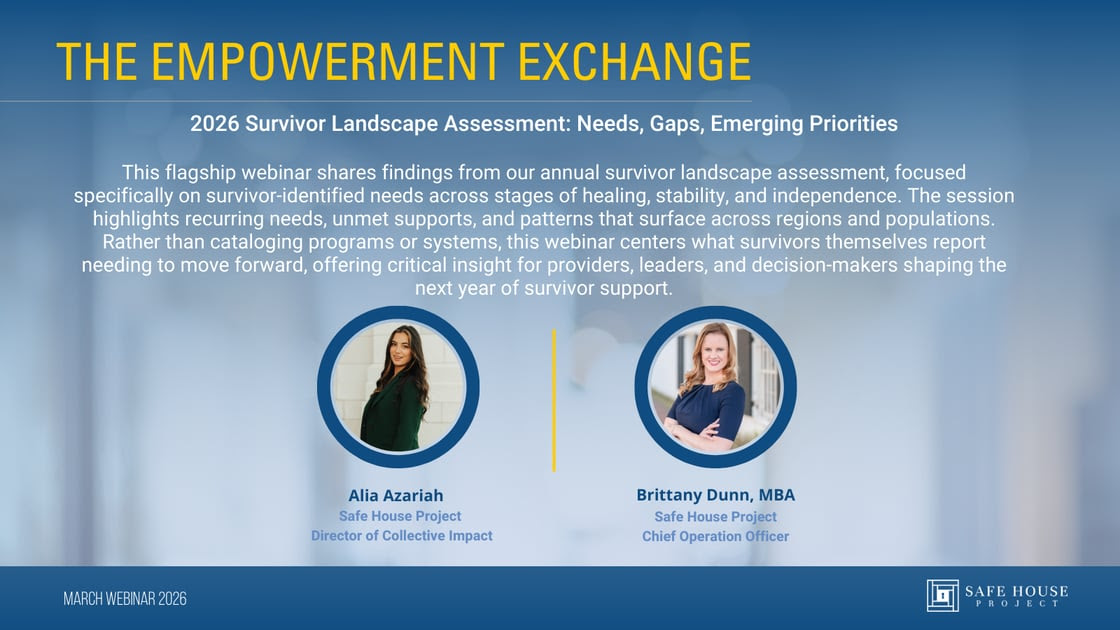 This year’s presentation will be led by Safe house Project’s Alia Azariah, Director of Director of Collective Impact, and Brittany Dunn, COO, offering both field-level and operational insight into what the data reveals and where the sector must respond.