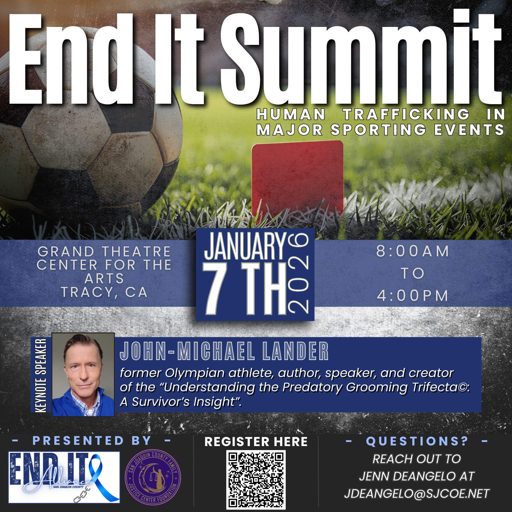 Join an important event that will make a real difference! Presented by San Joaquin County Office of Education, End It Alliance, and the San Joaquin County Family Justice Center Foundation, this summit brings together educators, nonprofits, law enforcement, community members, and county leaders to address the critical issue of human trafficking in San Joaquin County linked with major sporting events.