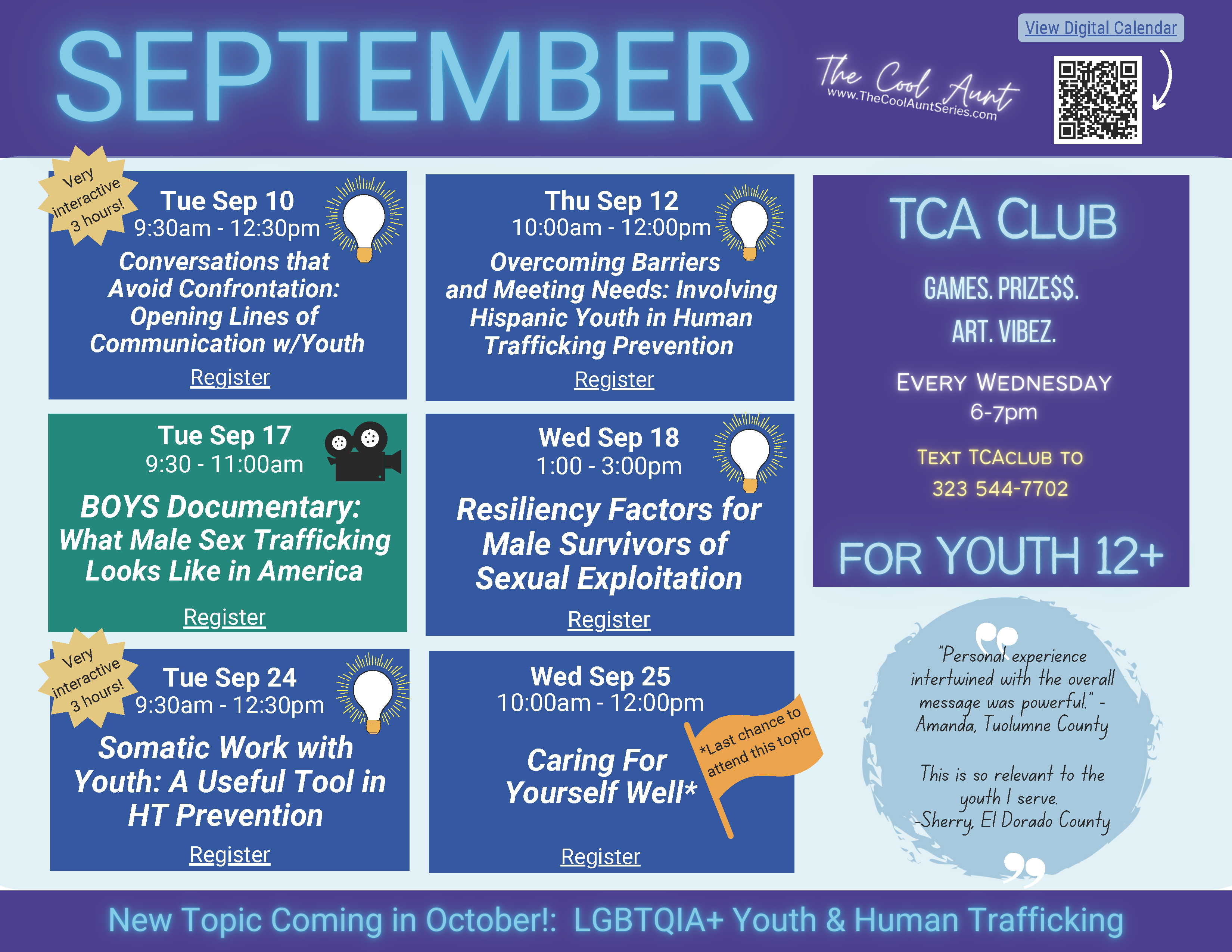Join TCA’s Nilda Otero as she dives into the topic of involving Hispanic youth in HT prevention. In this training, you will gain a deeper understanding of the common barriers and overlooked needs that can hinder Hispanic youth’s engagement in preventing human trafficking. Nilda will discuss practical strategies and solutions for navigating the unique terrain of getting Hispanic youth connected and engaged in HT Prevention. By the end of the training, you will have a clear understanding of how to set these young people up for success and equip them with the tools they need to overcome obstacles that might prevent them from participating fully. Don’t miss out on this opportunity to learn and make a difference!